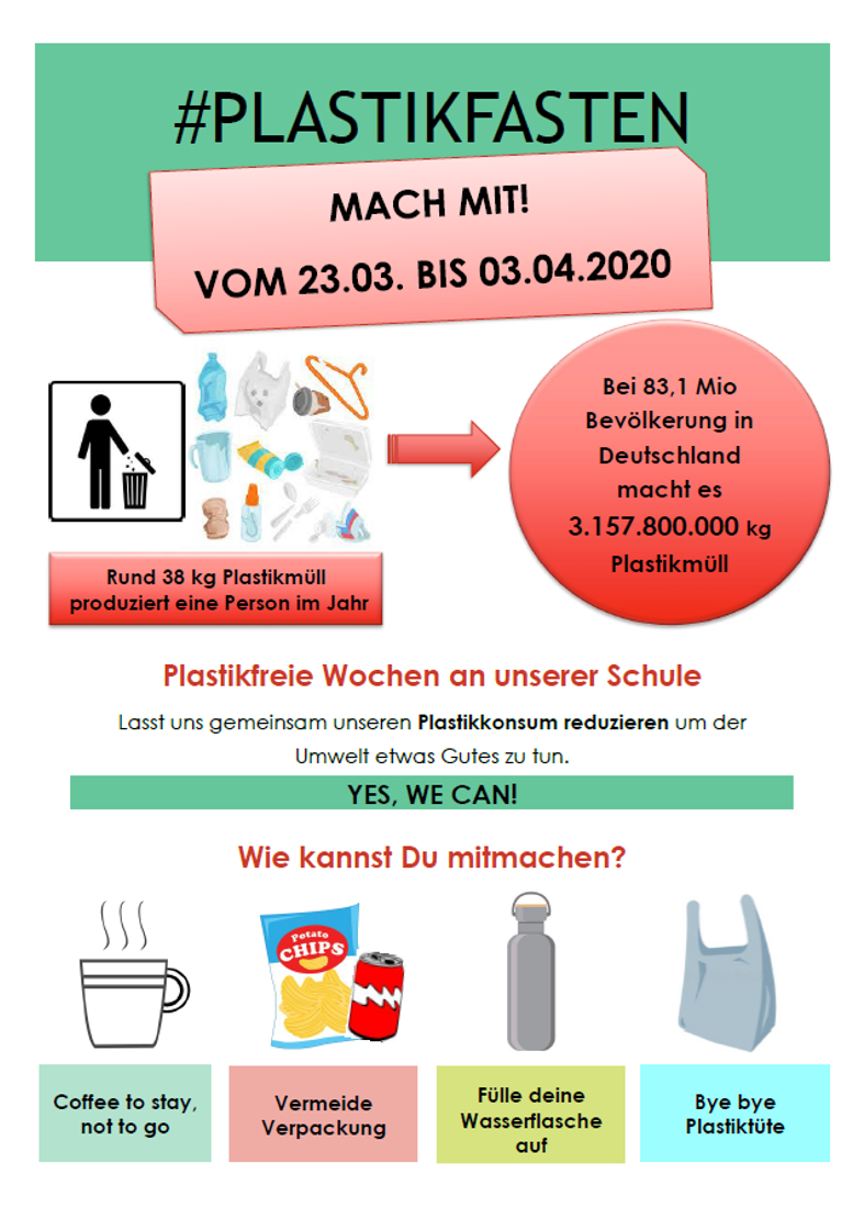 Deshalb haben wir beschlossen, im Rahmen einer Plastik-Fastenzeit die Schüler und auch uns selbst zu sensibilisieren.
